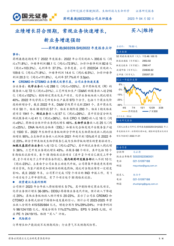 本报告对药明康德2022年年度报告进行了深入分析,公司业绩增长符合预期,CRDMO和CTDMO业务模式优势显著,新业务增速强劲,为未来发展提供动力。维持“买入”评级,但需关注订单增长、产能投放以及行业景气度等风险因素。