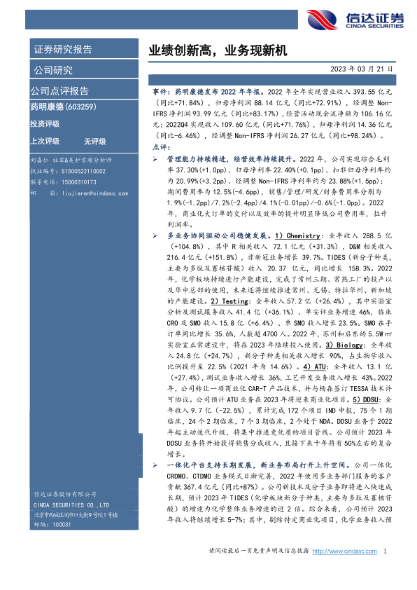 风险因素:行业竞争加剧、医药行业研发投入及外包需求下降、国内国际政策风险、新业务拓展不及预期等风险。