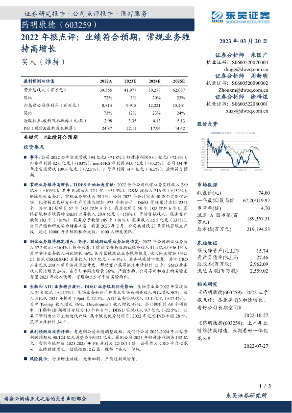 盈利预测与投资评级:考虑到公司业绩调整波动,我们将公司2023-2024年归母净利润预期从98/124亿元调整为99/122亿元,预测公司2025年归母净利润为152亿元,当前市值对应2023-2025年PE分别为22/18/14倍,公司作为CRO平台化龙头,业绩稳健增长,估值性价比凸显,维持“买入”评级。