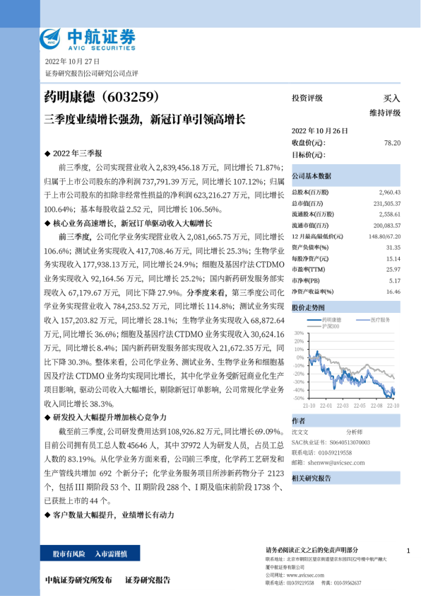 前三季度,公司化学业务实现营业收入2,081,665.75万元,同比增长106.6%;测试业务实现收入417,708.46万元,同比增长25.3%;生物学业务实现收入177,938.13万元,同比增长24.9%;细胞及基因疗法CTDMO业务实现收入92,164.56万元,同比增长25.2%;国内新药研发服务部实现收人67,179.67万元、同比下降27.9%。分季度来看,第三季度公司化学业务实现营业收入784,253.52万元,同比增长114.8%;测试业务实现收入157,203.82万元,同比增长28.1%;生物学业务实现收入68,872.64万元,同比增长36.6%;细胞及基因疗法CTDMO业务实现收入30,624.16万元,同比增长8.4%;国内新药研发服务部实现收入21,672.35万元,同比下降30.3%。整体来看,公司化学业务、测试业务、生物学业务和细胞基因及疗法CTDMO业务均实现同比增长,其中化学业务受新冠商业化生产项目影响、驱动公司收入大幅增长,剔除新冠订单影响,公司常规化学业务收入同比增长38.3%。