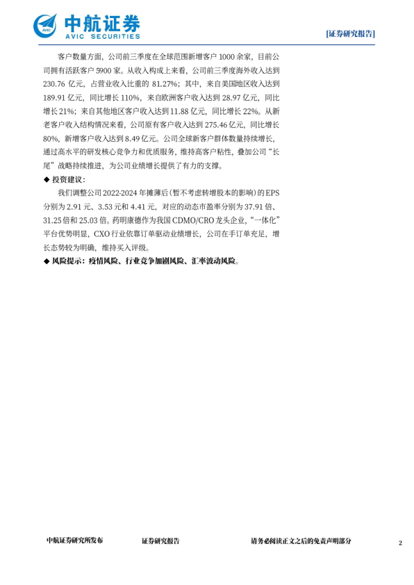 我们调整公司2022-2024年摊薄后(暂不考虑转增股本的影响)的EPS分别为2.91元、3.53元和4.41元,对应的动态市盈率分别为37.91倍、31.25倍和25.03倍。药明康德作为我国CDMO/CRO龙头企业,"一体化"平台优势明显,CXO行业依靠订单驱动业绩增长,公司在手订单充足,增长态势较为明确,维持买入评级。