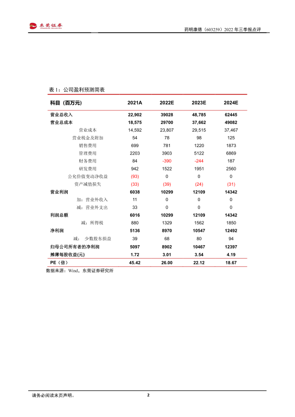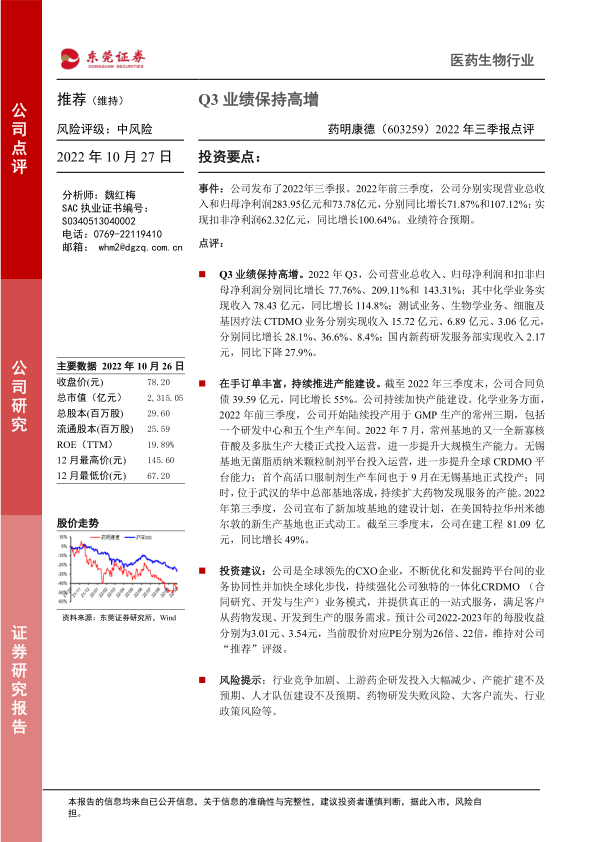 预计公司2022-2023年的每股收益分别为3.01元、3.54元,当前股价对应PE分别为26倍、22倍,维持对公司“推荐”评级。公司是全球领先的CXO企业,不断优化和发掘跨平台间的业务协同性并加快全球化步伐,持续强化公司独特的一体化CRDMO业务模式,并提供真正的一站式服务,满足客户从药物发现、开发到生产的服务需求。
