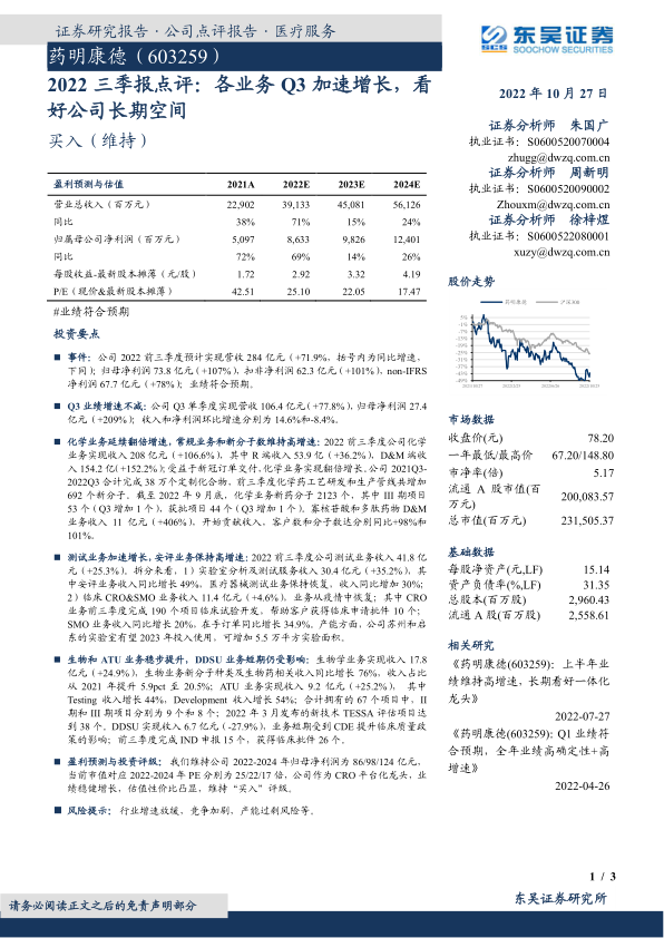 盈利预测与投资评级:我们维持公司2022-2024年归母净利润为86/98/124亿元,当前市值对应2022-2024年PE分别为25/22/17倍,公司作为CRO平台化龙头,业绩稳健增长,估值性价比凸显,维持“买入”评级。