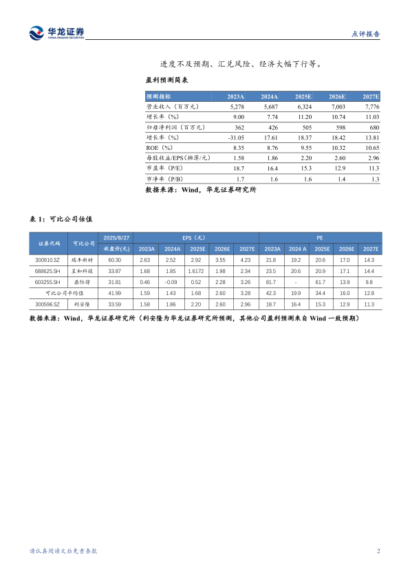 盈利预测和投资评级:公司在深耕主业的同时,不断强化技术和产品资源的内生和外延扩展,推进业务多元化。预计公司2025-2027年归母净利润分别为5.05/5.98/6.80亿元,当前股价对应2025-2027年PE为15.3/12.9/11.3倍,我们选取瑞丰新材、宿迁联盛、鼎际得作为可比公司,公司作为国内高分子材料抗老化行业的龙头企业,为国内唯一能够全面覆盖塑料、橡胶、纤维、胶黏剂、涂料等高分子材料领域的供应商,控股子公司锦州康泰拥有成熟的产品线布局及技术储备,并与国际四大润滑油添加剂公司建立了产业链合作,首次覆盖,给予公司“增持”评级。