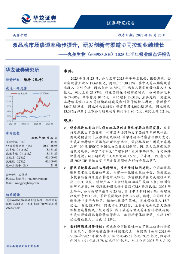 丸美生物2025年半年报显示,公司通过双品牌战略、研发创新和渠道协同,实现了业绩的稳步增长。丸美和PL恋火两大品牌在各自的细分市场均表现出色,线上线下渠道协同发展。公司在技术研发方面持续投入,并取得显著成果。华龙证券研究所维持对丸美生物的“增持”评级,但同时也提示了行业竞争、新品培育等风险。