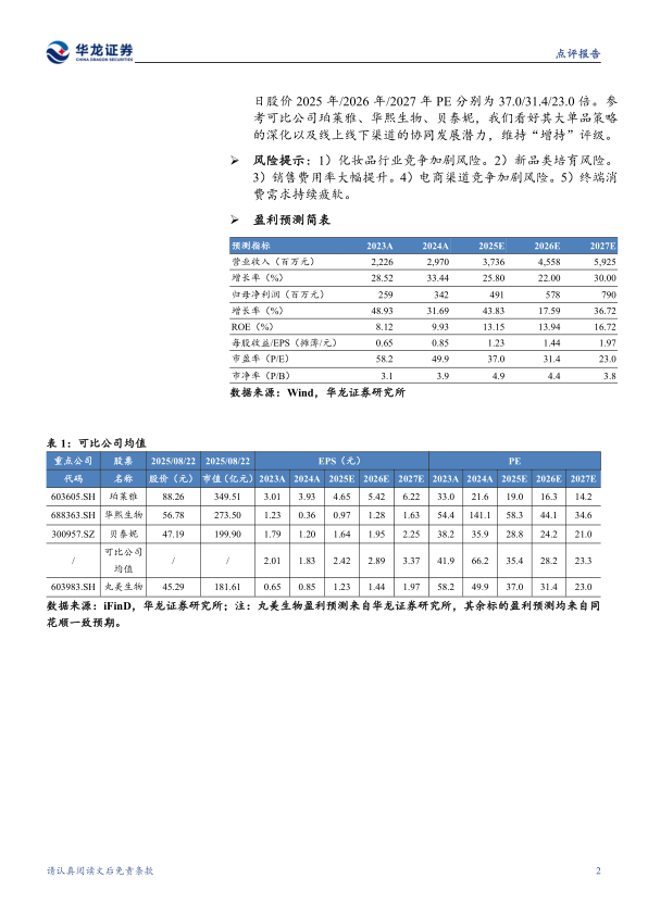 盈利预测及投资评级:考虑到公司阶段性加大了线上业务相关的资源投入,整体经营态势保持稳健向上,我们预计公司2025年/2026年/2027年收入为37.36亿元/45.58亿元/59.25亿元,归母净利润为4.91亿元/5.78亿元/7.90亿元。对应公司2025年8月22日股价2025年/2026年/2027年PE分别为37.0/31.4/23.0倍。参考可比公司珀莱雅、华熙生物、贝泰妮,我们看好其大单品策略的深化以及线上线下渠道的协同发展潜力,维持“增持”评级。
