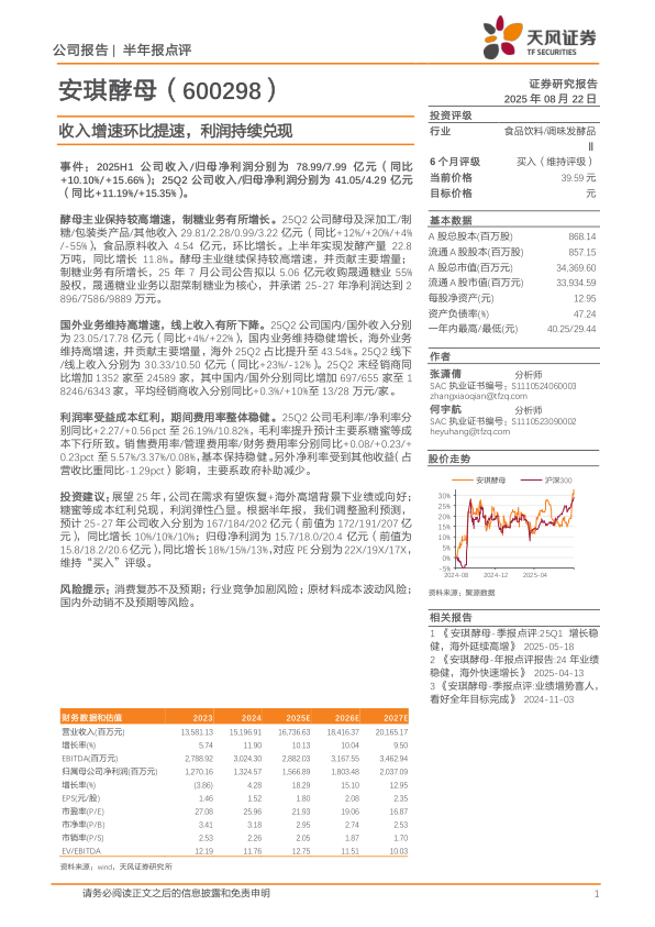 投资建议:展望25年,公司在需求有望恢复+海外高增背景下业绩或向好;糖蜜等成本红利兑现,利润弹性凸显。根据半年报,我们调整盈利预测,预计25-27年公司收入分别为167/184/202亿元(前值为172/191/207亿元),同比增长10%/10%/10%;归母净利润为15.7/18.0/20.4亿元(前值为15.8/18.2/20.6亿元),同比增长18%/15%/13%,对应PE分别为22X/19X/17X,维持“买入”评级。