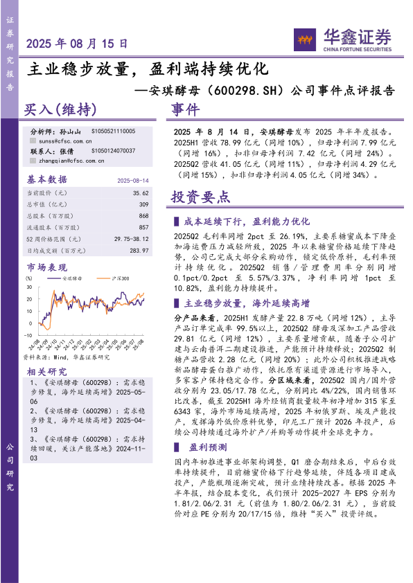 国内年初推进事业部架构调整,Q1磨合期结束后,中后台效率持续提升,目前糖蜜价格下行趋势延续,伴随各项目建成投产,产能瓶颈逐渐突破,预计业绩持续改善。根据2025年半年报,结合股本变化,我们预计2025-2027年EPS分别为1.81/2.06/2.31元(前值为1.80/2.06/2.31元),当前股价对应PE分别为20/17/15倍,维持“买入”投资评级。