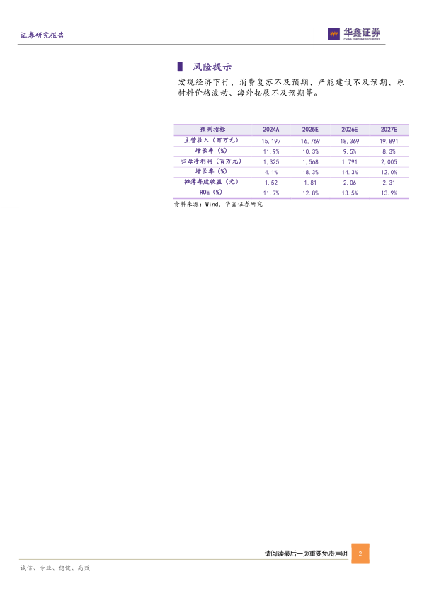 宏观经济下行、消费复苏不及预期、产能建设不及预期、原材料价格波动、海外拓展不及预期等。