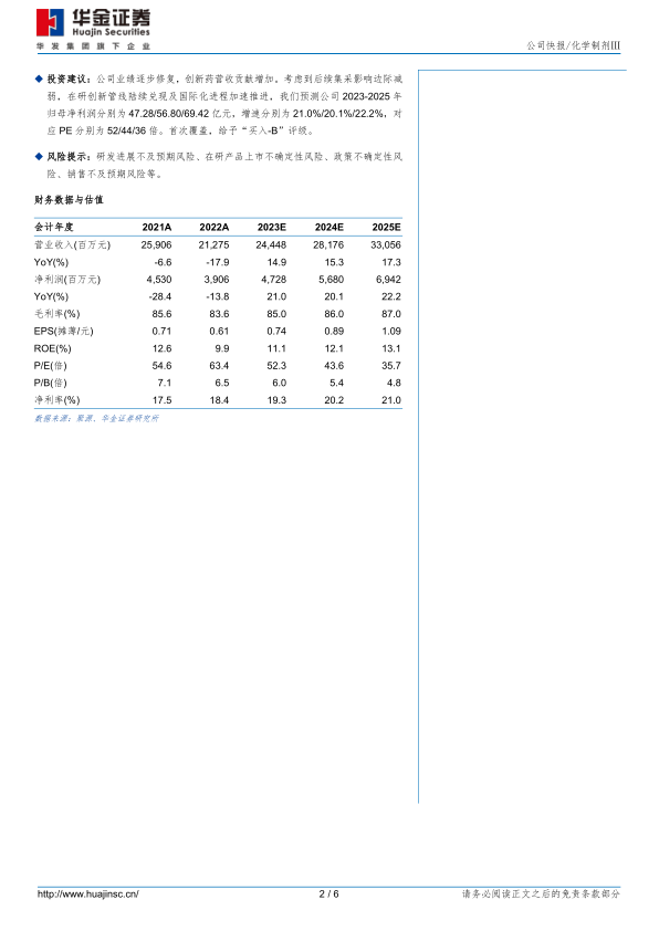 投资建议:公司业绩逐步修复,创新药营收贡献增加。考虑到后续集采影响边际减弱,在研创新管线陆续兑现及国际化进程加速推进,我们预测公司2023-2025年归母净利润分别为47.28/56.80/69.42亿元,增速分别为21.0%/20.1%/22.2%,对应PE分别为52/44/36倍。首次覆盖,给予“买入-B”评级。