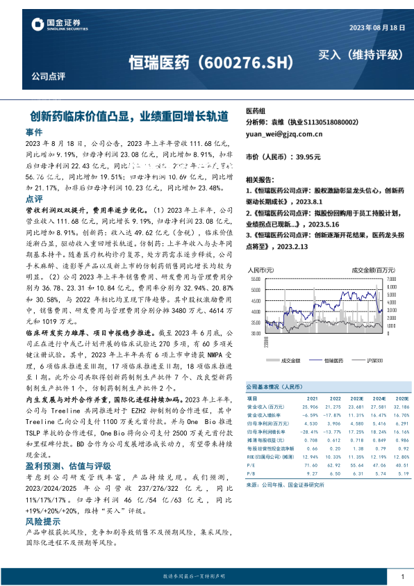 营收利润双双提升, 费用率逐步优化。 ( 1) 2023 年上半年,公司营业收入 111.68 亿元,同比增长 9.19%, 归母净利润 23.08 亿元,同比增加 8.91%。 创新药: 收入达 49.62 亿元(含税), 临床价值逐渐凸显,驱动收入重回增长轨道。 仿制药:上半年收入与去年同期基本持平。随着医疗机构诊疗复苏,处方药需求逐步释放,公司手术麻醉、造影等产品以及新上市的仿制药销售同比增长均较为明显。 ( 2) 公司 2023 年上半年销售费用、研发费用与管理费用分别为 36.78、 23.31 和 10.84 亿元,费用率分别为 32.94%、 20.87%和 30.58%,与 2022 年相比均呈现下降趋势。 其中股权激励费用中,销售费用、研发费用与管理费用分别分摊 3480 万元、 4614 万元和 1019 万元。