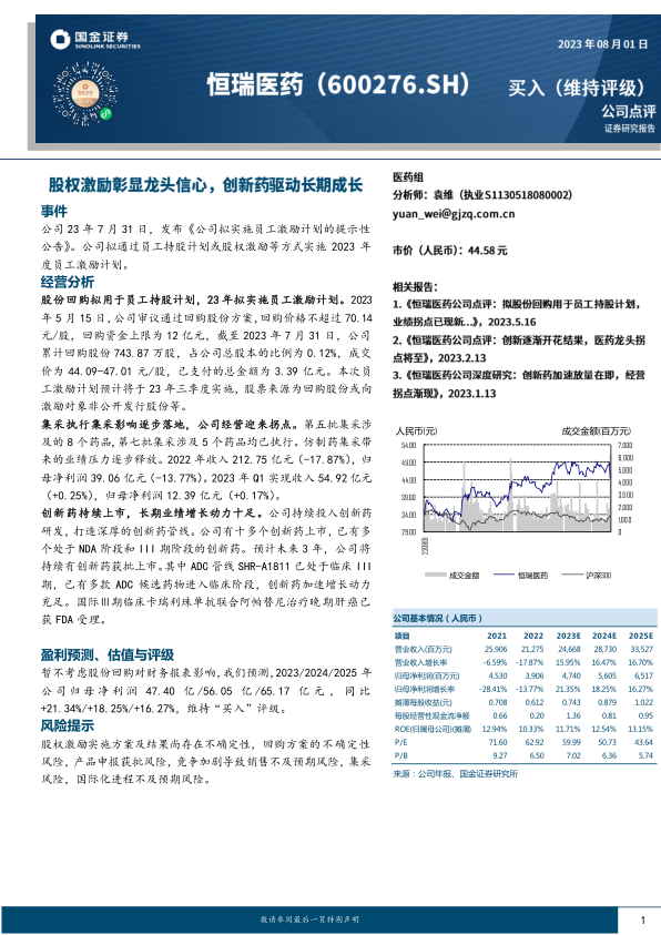 本报告分析了恒瑞医药拟实施员工激励计划、集采影响逐步落地以及创新药驱动增长等关键因素。公司通过股份回购和员工激励计划,有望提升团队凝聚力。集采带来的业绩压力逐步释放,同时创新药的持续上市为公司长期业绩增长提供强劲动力。维持“买入”评级,但需关注股权激励、产品申报、市场竞争、集采以及国际化进程等风险。