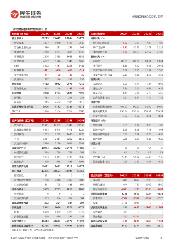 关注年底医保谈判助力创新药放量。目前,公司已上市自研创新药达到13款、合作引进创新药达到2款。其中,近期获批上市的林普利塞、阿得贝利单抗、瑞格列汀、奥特康唑等创新药,以及吡咯替尼一线适应症、达尔西利一线适应症等新增适应症符合今年医保目录调整要求,有望今年底参与医保谈判,进一步扩大可及性,助力销售放量。