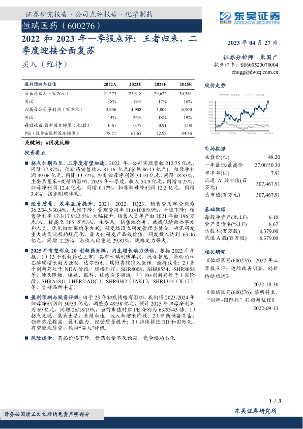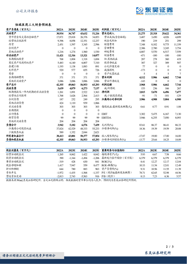 本报告对恒瑞医药2022年年报和2023年一季报进行了点评,核心观点如下: