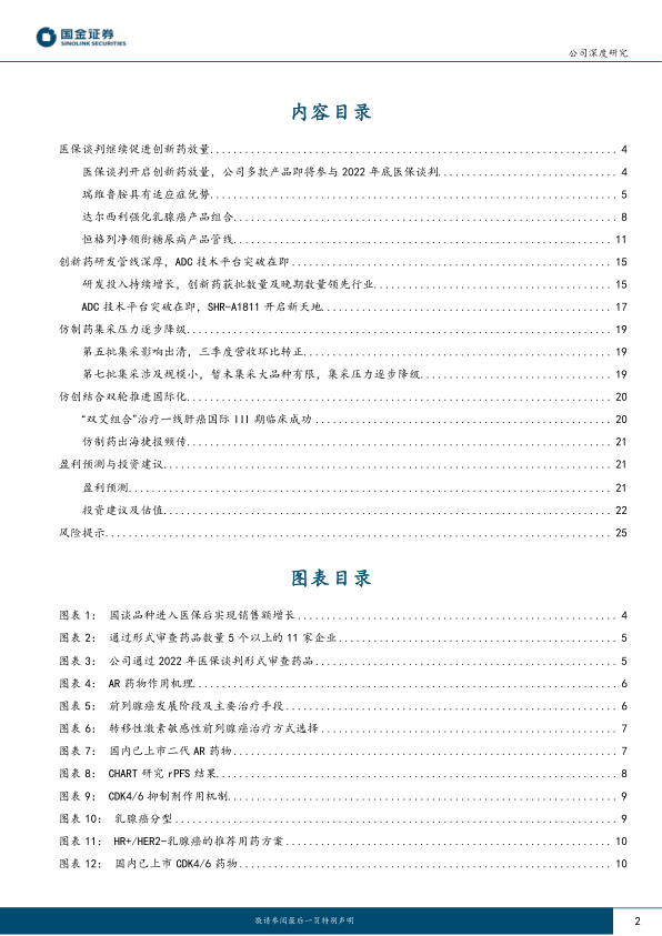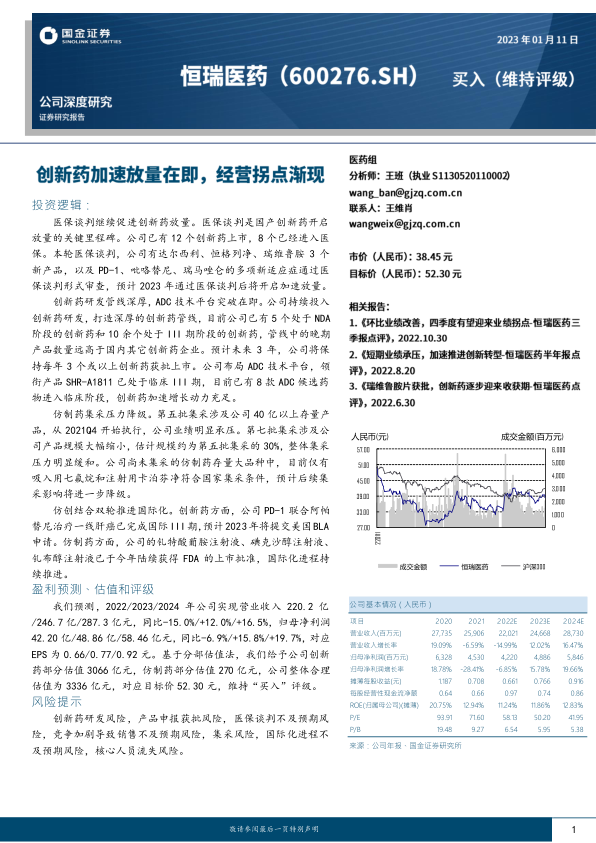 我们预测,2022/2023/2024年公司实现营业收入220.2亿/246.7亿/287.3亿元,同比-15.0%/+12.0%/+16.5%,归母净利润42.20亿/48.86亿/58.46亿元,同比-6.9%/+15.8%/+19.7%,对应EPS为0.66/0.77/0.92元。基于分部估值法,我们给予公司创新药部分估值3066亿元,仿制药部分估值270亿元,公司整体合理估值为3336亿元,对应目标价52.30元,维持“买入”评级。
