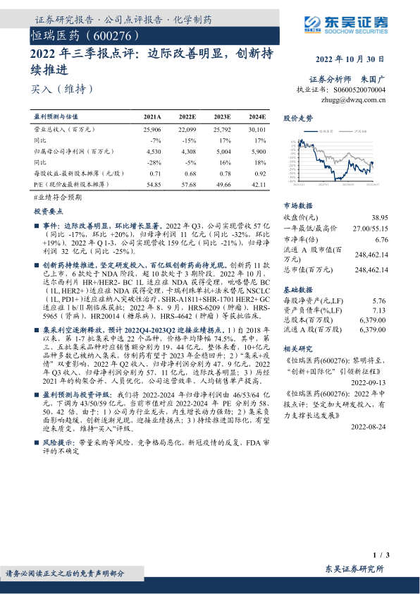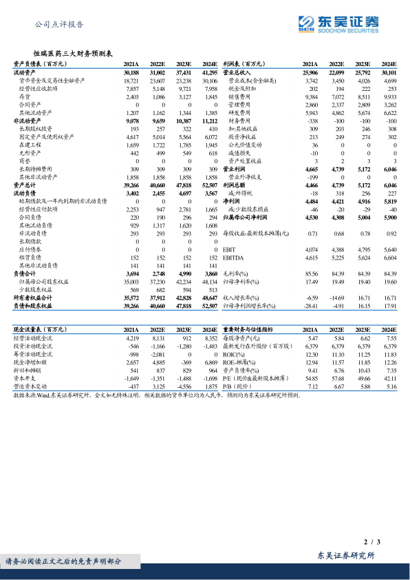 盈利预测与投资评级:我们将2022-2024年归母净利润由46/53/64亿元,下调为43/50/59亿元,当前市值对应2022-2024年PE分别为58、50、42倍。由于:1)公司为行业龙头,内生增长动力强劲;2)集采负面影响趋缓,创新逐渐兑现,迎接业绩拐点;3)持续推进国际化,有望迎来质变,维持“买入”评级。