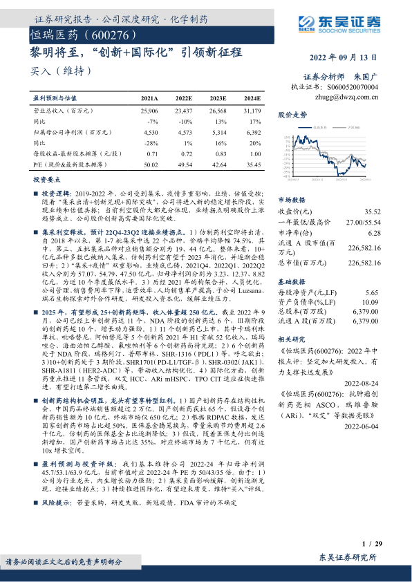 风险提示:带量采购,研发失败,新冠疫情,FDA审评的不确定