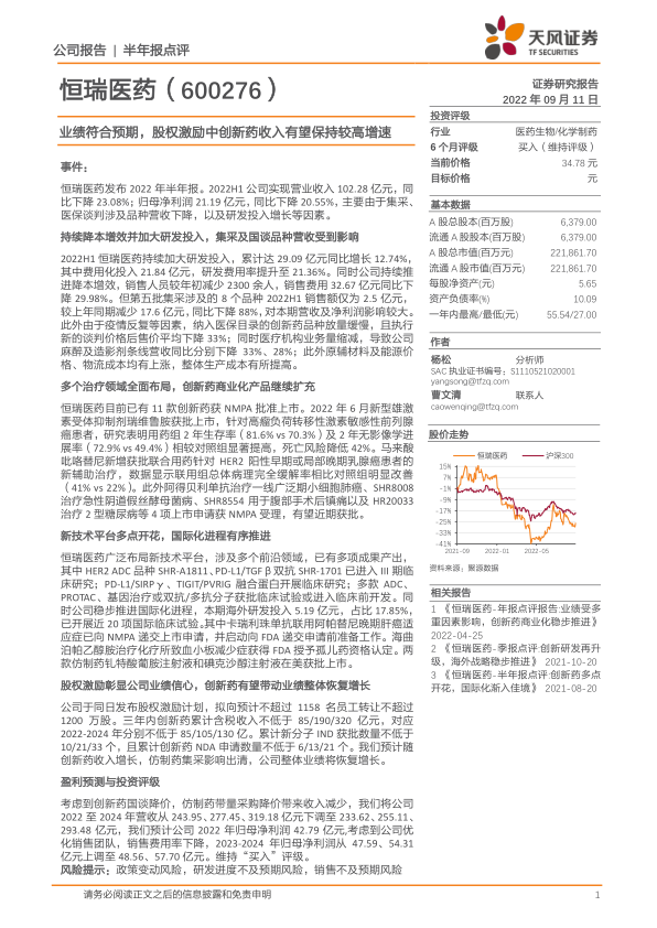 恒瑞医药广泛布局新技术平台,涉及多个前沿领域,已有多项成果产出,其中HER2ADC品种SHR-A1811、PD-L1/TGFβ双抗SHR-1701已进入III期临床研究;PD-L1/SIRPγ、TIGIT/PVRIG融合蛋白开展临床研究;多款ADC、PROTAC、基因治疗或双抗/多抗分子获批临床试验或进入临床前开发。同时公司稳步推进国际化进程,本期海外研发投入5.19亿元,占比17.85%,已开展近20项国际临床试验。其中卡瑞利珠单抗联用阿帕替尼晚期肝癌适应症已向NMPA递交上市申请,并启动向FDA递交申请前准备工作。海曲泊帕乙醇胺治疗化疗所致血小板减少症获得FDA授予孤儿药资格认定。两款仿制药钆特酸葡胺注射液和碘克沙醇注射液在美获批上市。股权激励彰显公司业绩信心,创新药有望带动业绩整体恢复增长公司于同日发布股权激励计划,拟向预计不超过1158名员工转让不超过1200万股。三年内创新药累计含税收入不低于85/190/320亿元,对应2022-2024年分别不低于85/105/130亿。累计新分子IND获批数量不低于10/21/33个,且累计创新药NDA申请数量不低于6/13/21个。我们预计随创新药收入增长,仿制药集采影响出清,公司整体业绩将恢复增长。