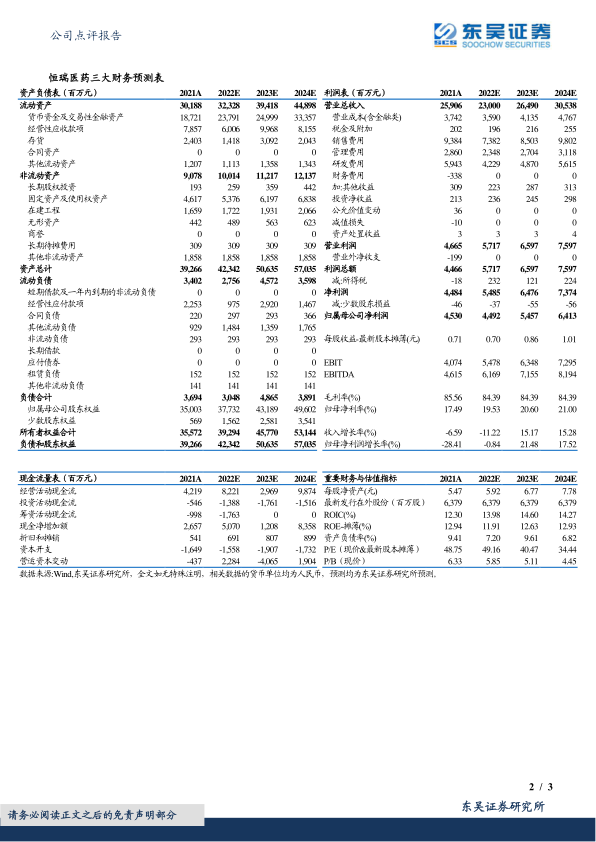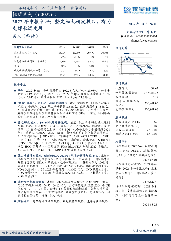尽管报告下调了对公司2022-2024年的盈利预测,但考虑到集采影响的逐渐缓解和创新药的陆续兑现,以及公司管理精细化和研发费用资本化带来的利润增长潜力,维持对恒瑞医药的“买入”评级。