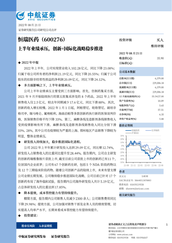 公司上半年业绩承压主要受到三方面影响。首先,仿制药集采方面,2021年9月开始陆续执行的第五批集采涉及的8个药品,2022年上半年销售收入仅2.5亿元,较去年同期减少17.6亿元,同比下滑88%。其次,创新药收入增长较慢。2022年1月1日起,阿帕替尼、吡咯替尼、硫培非格司亭、瑞马唑仑、氟唑帕利、海曲泊帕等多款创新药执行新的医保谈判价格,医保销售价格平均下降33%。第三,麻醉条线及造影剂条线销售收入受到疫情影响有所下滑。麻醉条线及造影剂条线销售收入同比分别下滑33%、28%,其中公司在疫情较为严重的上海、郑州地区产品销售下降较为明显,整体业绩承压。