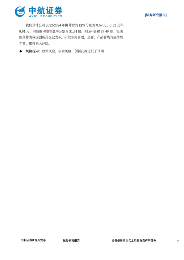 我们预计公司2022-2024年摊薄后的EPS分别为0.69元、0.82元和0.91元,对应的动态市盈率分别为51.91倍、43.64倍和39.49倍。恒瑞医药作为我国创新药企业龙头,研发布局合理、全面,产品管线有望持续丰富,维持买入评级