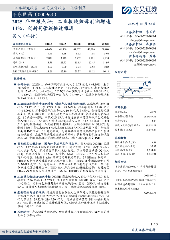 盈利预测与投资评级:考虑到医美业务收入上半年同比下滑及创新品种上市推广阶段,我们将2025-2027年公司归母净利润由40.32/45.55/51.54亿元下调至39.32/44.21/49.50亿元,对应当前市值的PE估值分别为20/18/16倍。考虑到公司业绩稳健增长,创新药品种逐步上市贡献业绩,维持“买入”评级。