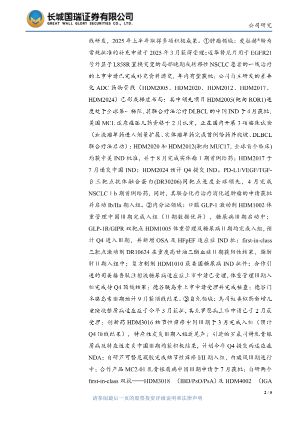 深耕三大治疗领域,创新药研发管线突破80项:今年上半年,公司医药工业研发投入(不含股权投资)14.84亿元,同比增长33.75%,其中直接研发支出11.74亿元,同比增长54.21%,直接研发支出占医药工业营收比例为15.97%。公司创新药研发中心正在推进80余项创新药管线研发,2025年上半年取得多项积极成果。①肿瘤领域:爱拉赫®转为常规批准的补充申请于2025年3月获得受理;迈华替尼片用于EGFR21号外显子L858R置换突变的局部晚期或转移性NSCLC患者的一线治疗的上市申请已完成补充资料递交,年内有望获批;公司自主研发的差异化ADC药物管线(HDM2005、HDM2020、HDM2012、HDM2017、HDM2024)已形成梯度布局:其中领先项目HDM2005(靶向ROR1)进度处于全球第一梯队,其联合疗法治疗DLBCL的中国IND于4月获批,美国MCL适应症孤儿药资格于2月认定,正在国内开展3项临床试验(血液瘤单药进入剂量扩展、实体瘤单药完成首例给药并爬坡、DLBCL联合疗法启动);HDM2020和HDM2012(靶向MUC17,全球首个临床)均获中美IND批准,并于8月完成实体瘤Ⅰ期首例给药;HDM2017于7月递交中国IND;HDM2024预计Q4提交IND。PD-L1/VEGF/TGF-β三靶点抗体融合蛋白(DR30206)同靶点进度全球领先,4月完成NSCLCⅠb期首例给药,同时,其联合化疗治疗消化道肿瘤的申请获批并启动Ib/IIa期入组。②内分泌领域:口服GLP-1激动剂HDM1002体重管理中国Ⅲ期完成入组(Ⅱ期数据优异),糖尿病Ⅲ期启动中;GLP-1R/GIPR双靶点HDM1005体重管理及糖尿病Ⅱ期均完成入组,预计Q4进入Ⅲ期,并新增OSA及HFpEF适应症IND批;first-in-class三靶点激动剂DR10624在重度高甘油三酯血症Ⅱ期获阳性结果,脂肪肝Ⅱ期入组中;复方制剂HDM1010获美国糖尿病IND批件;合作引进的司美格鲁肽注射液糖尿病适应症上市申请已受理,体重管理Ⅲ期入组完成待Q4顶线结果;德谷胰岛素上市申请受理并完成核查;德谷门冬胰岛素Ⅲ期预计9月获顶线结果。③自免领域:乌司奴类似药新增儿童斑块银屑病适应症于今年3月获批,其克罗恩病上市申请已于2月获受理;创新药HDM3016结节性痒疹中国Ⅲ期于3月完成入组(预计Q4顶线结果),特应性皮炎Ⅲ期入组近尾声;引进的罗氟司特乳膏银屑病及特应性皮炎中国Ⅲ期均获积极结果,计划今年Q4提交两适应症NDA;自研芦可替尼凝胶完成结节性痒疹I/II期入组,白癜风Ⅲ期进行中;合作产品MC2-01乳膏银屑病中国Ⅲ期申请于7月获批;自研两个first-in-class双抗——HDM3018(IBD/PsO/PsA)及HDM4002(IGA肾病)均处于IND开发阶段,预计2026年Q3前完成中美IND申报。