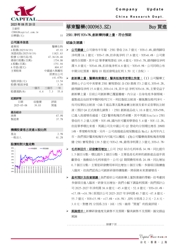 创新药上量,医药商业稳定,医美板块季度环比恢复:(1)公司医药工业核心子公司中美华东25H1实现营收(含CSO业务)73.2亿元,YOY+9.2%,录得归母净利15.8亿元,YOY+14.1%,其中Q2净利YOY+16.3%,主要受益于创新药上量,目前公司创新药已覆盖肿瘤、内分泌、自身免疫多个领域,重点産品包括苯甲酸阿格列汀片、利拉鲁肽注射液、脯氨酸加格列净片、乌司奴单抗注射液、CAR-T産品泽沃基奥仑赛注射液及索米妥昔单抗注射液(预计Q4正式商业化销售),25H1创新産品收入10.8亿元,YOY+59%,已进入高速增长通道;(2)医美板块仍然承压,其中英国Sinclair25H1营收约5.2亿人民币,YOY-8%,国内欣可丽美学营收5.4亿,YOY-12.2%,但从单季环比来看,英国公司及中国公司Q2营收均分别环比增长20%和14%,季度略有恢复,另外,公司高端産品玻尿酸産品MaiLi系列年内上市,我们预计医美板块年内可能可以触底;(3)公司医药商业板块表现稳健,25H1实现营收139.5亿元,YOY+2.9%,录得净利润2.3亿元,YOY+3.7%。