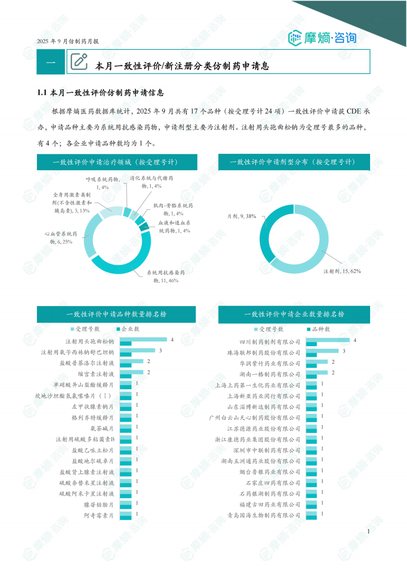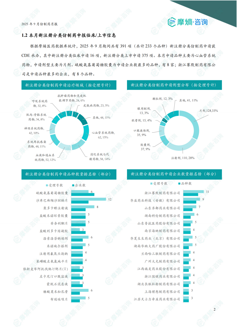 本月一致性评价/新注册分类仿制药申请息 1.1本月一致性评价仿制药申请信息 根据摩熵医药数据库统计,2025年9月共有17个品种(按受理号计24项)一致性评价申请获CDE承办,申请品种主要为系统用抗感染药物,申请剂型主要为注射剂。注射用头孢曲松钠为受理号最多的品种,有4个;各企业申请品种数均为1个。 1.2本月新注册分类仿制药申报临床/上市信息 根据摩熵医药数据库统计,2025年9月期间共有391项(共计233个品种)新注册分类仿制药申请获CDE承办,其中新注册分类临床申请16项,新注册分类上市申请375项。本月申请品种主要为心血管系统药物,申请剂型主要为片剂。硫酸氨基葡萄糖胶囊为申请企业数最多的品种,有8家;浙江赛默制药有限公司是申请品种最多的企业,有8个品种。
