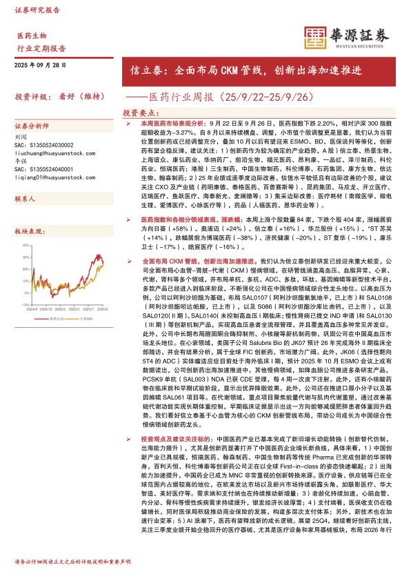 医药行业周报:信立泰:全面布局CKM管线,创新出海加速推进