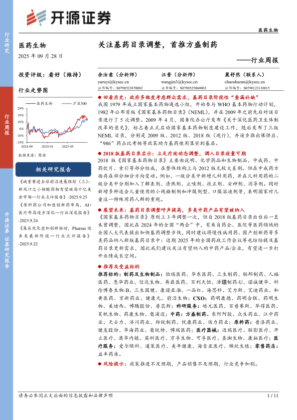 医药生物行业周报:关注基药目录调整,首推方盛制药