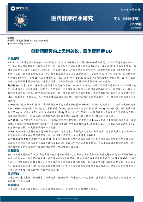 医药健康行业研究:创新药趋势向上无惧关税,四季度静待BD