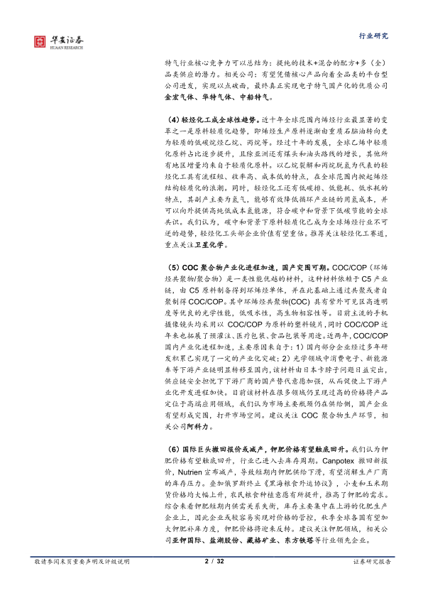 (5)COC聚合物产业化进程加速,国产突围可期。COC/COP(环烯烃共聚物/聚合物)是一类性能优越的材料,这种材料依赖于C5产业链,由C5原料制备得到环烯烃单体,并在此基础上通过共聚或者自聚制得COC/COP。其中环烯烃共聚物(COC)具有紫外可见区高透明度等优良的光学性能,低吸水性,高生物相容性等。目前主流的手机摄像镜头均采用以COC/COP为原料的塑料镜片,同时COC/COP近年来也拓展了预灌注、医疗包装、食品包装等用途。近两年,COC/COP国内产业化进程加速,主要原因来自于:1)国内部分企业经过多年研发积累已实现了一定的产业化突破;2)光学领域中消费电子、新能源车等下游产业链明显转移至国内,该材料由日本卡脖子问题日益突出,供应链安全担忧下下游厂商的国产替代意愿加强,从而促使上下游产业化开发进程加快。目前该材料在很多领域仍呈现过高的价格将产品定位于高端应用领域,我们认为市场主要瓶颈仍在供给侧,国产企业有望形成突围,打开市场空间。建议关注COC聚合物生产环节,相关公司阿科力。