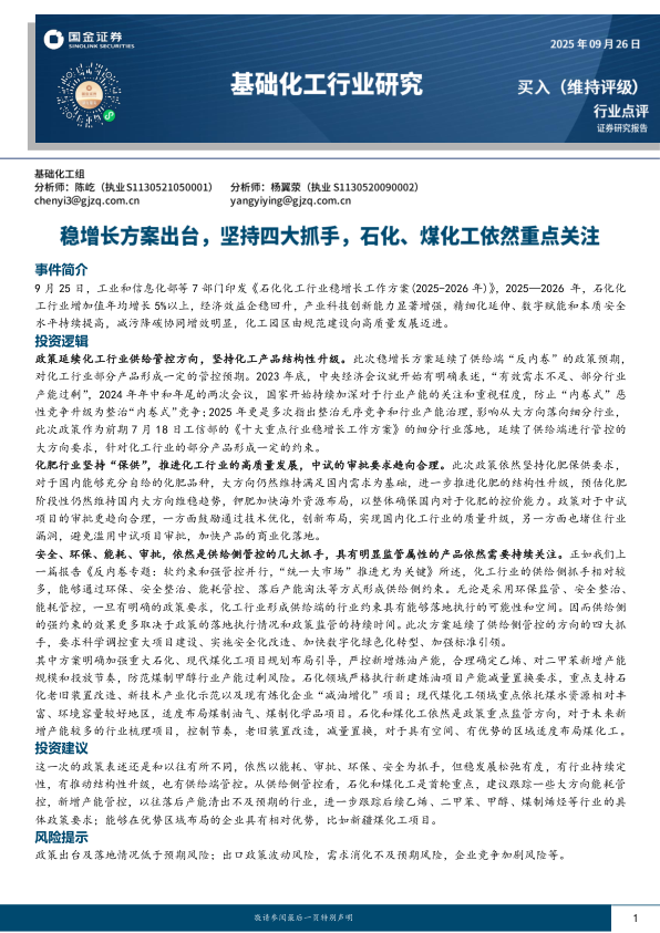 基础化工行业研究:稳增长方案出台,坚持四大抓手,石化、煤化工依然重点关注
