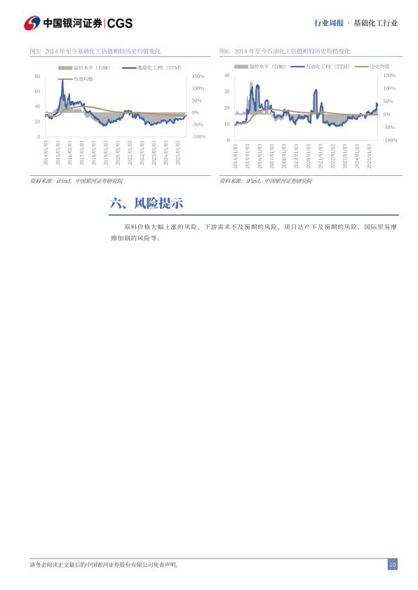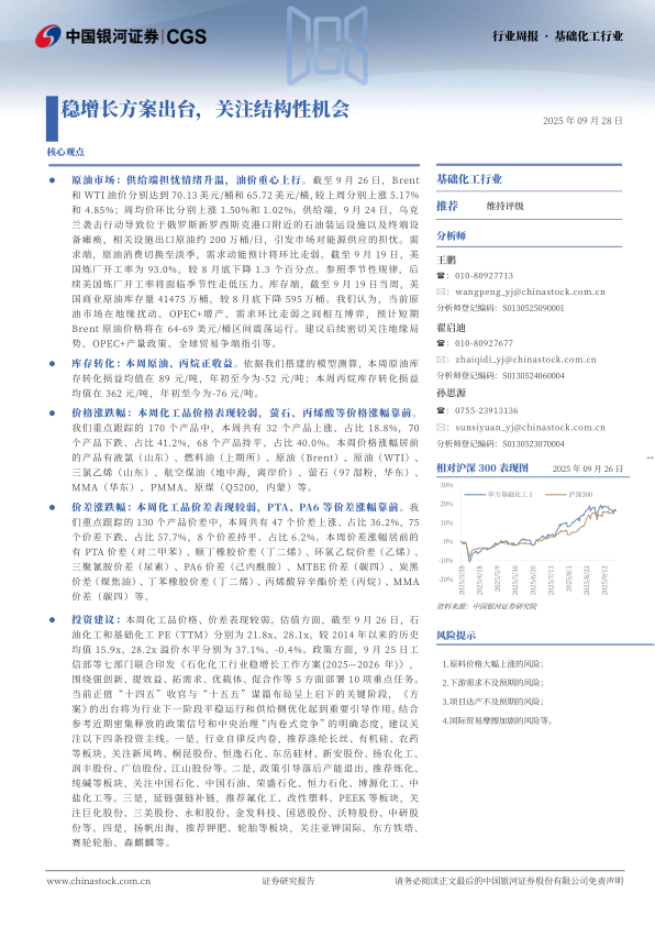 投资建议:本周化工品价格、价差表现较弱。估值方面,截至9月26日,石油化工和基础化工PE(TTM)分别为21.8x、28.1x,较2014年以来的历史均值15.9x、28.2x溢价水平分别为37.1%、-0.4%。政策方面,9月25日工信部等七部门联合印发《石化化工行业稳增长工作方案(2025—2026年)》,围绕强创新、提效益、拓需求、优载体、促合作等5方面部署10项重点任务。