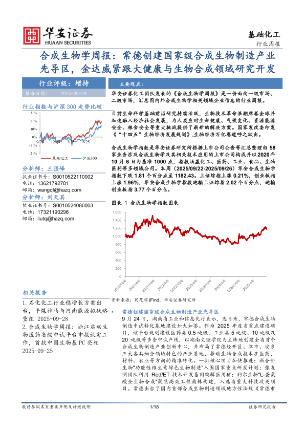 合成生物学指数是华安证券研究所根据上市公司公告等汇总整理由58家业务涉及合成生物学及其相关技术应用的上市公司构成并以2020年10月6日为基准1000点,指数涵盖化工、医药、工业、食品、生物医药等多领域公司。本周(2025/09/22-2025/09/26)华安合成生物学指数下跌1.81个百分点至1182.43。上证综指上涨0.21%,创业板指上涨1.96%,华安合成生物学指数跑输上证综指2.02个百分点,跑输创业板指3.77个百分点。
