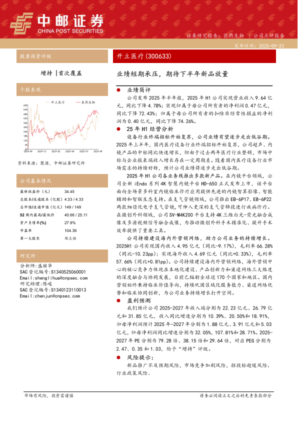 本报告对开立医疗(300633)进行了首次覆盖,并给予“增持”评级。报告分析了公司2025年上半年的业绩表现,认为短期业绩承压,但随着医疗设备行业终端招标的复苏和公司新品的陆续推出,预计下半年业绩将有所改善。