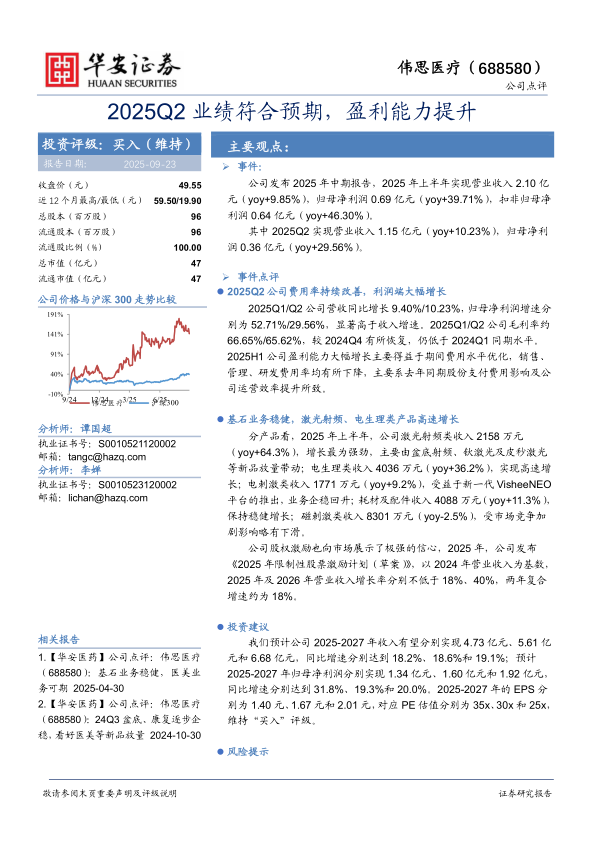 本报告对伟思医疗2025Q2业绩进行了分析,认为公司业绩符合预期,盈利能力提升,主要得益于费用率的改善和激光射频、电生理类产品的高速增长。公司发布股权激励计划,彰显了对未来发展的信心。维持“买入”评级,但需注意新品研发推广不及预期和市场竞争加剧的风险。
