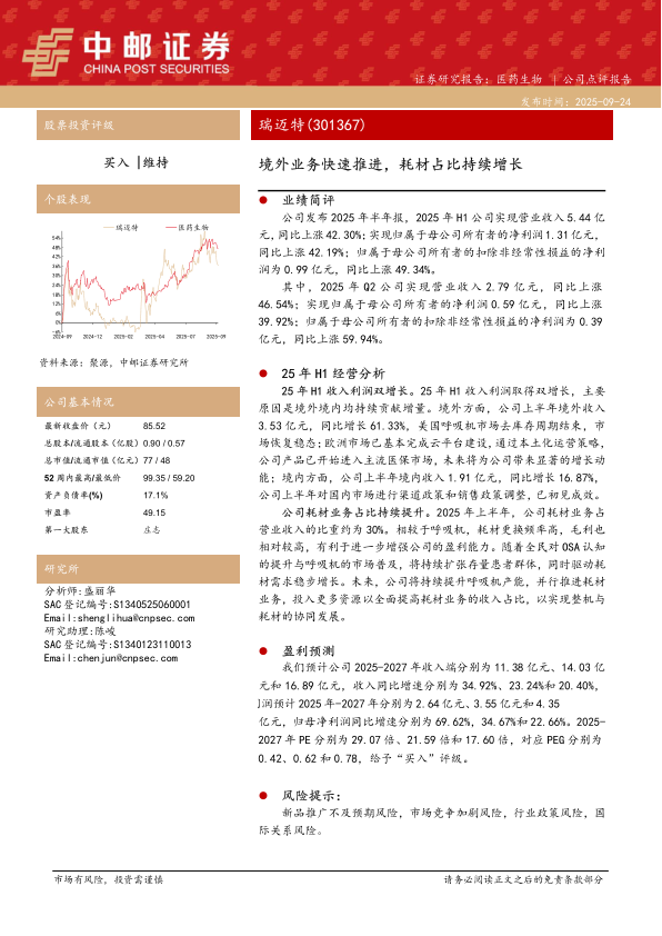 本报告分析了瑞迈特2025年半年度的业绩表现,认为公司在境外业务的快速推进和国内市场调整的背景下,实现了营收和利润的双增长。同时,耗材业务占比的提升将进一步增强公司的盈利能力。维持“买入”评级,但需关注新品推广、市场竞争、行业政策和国际关系等风险。