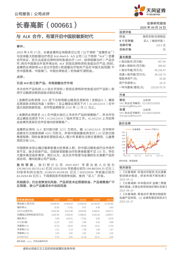 2025年9月17日,长春金赛药业有限责任公司(以下简称“金赛药业”)与全球最大的脱敏治疗药企ALK-Abelló A/S公司(以下简称“ALK”)签署合作协议,双方达成变应原特异性免疫治疗(AIT,俗称脱敏治疗)产品合作,将在中国联合开发并商业化ALK的变应原特异性免疫治疗产品;同时,金赛药业将获得ALK自主开发的3款脱敏治疗相关产品在中国大陆范围(不含中国香港,中国澳门,中国台湾地区)的独家代理权益。