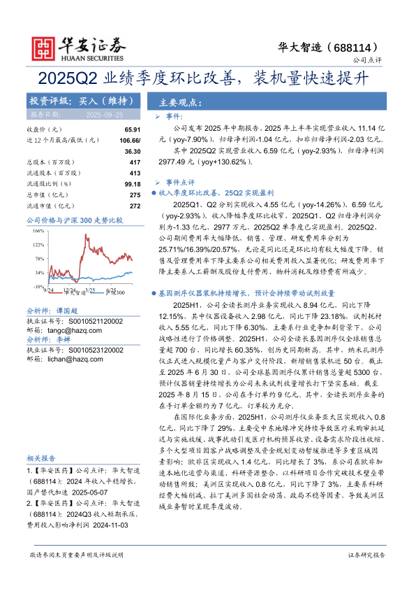 本报告分析了华大智造2025Q2的业绩表现,指出公司收入环比改善并实现盈利,费用率显著降低。基因测序仪装机量持续增长,为未来试剂放量奠定基础。国际化业务受地缘政治等因素影响,各区域表现不一。维持“买入”评级,但需关注市场竞争和地缘政治风险。