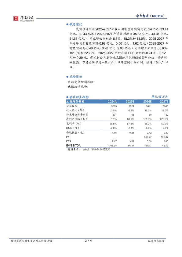 我们预计公司2025-2027年收入端有望分别实现28.24亿元、33.41亿元、39.43亿元(2025-2027年前值预测为35.83亿元、43.31亿元、51.63亿元),同比增长分别为-6.3%、18.3%和18.0%,2025-2027年归母净利润有望实现-0.98亿元、0.50亿元、1.62亿元(2025-2027年前值预测为-0.46亿元、0.70亿元、2.00亿元),同比增长分别为83.6%、151.0%和223.2%。2025-2027年对应的EPS分别约-0.24元、0.12元和0.39元,考虑到公司是全球基因测序仪领域的领军企业,资产稀缺性高,下游应用市场一旦打开,市场空间十分广阔,维持“买入”评级。