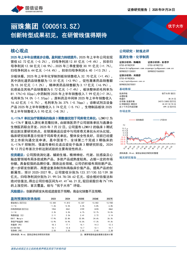 投资建议:公司围绕消化道、辅助生殖、精神神经、代谢、抗感染及心脑血管领域布局多款成熟产品,多款产品成熟度较高,占据一定的市场份额,具备较强的品牌价值。围绕这些领域,公司仍积极布局创新产品,进一步研发创新药、高壁垒复杂制剂和高临床价值产品,提高产品的创新属性。预计2025-2027年,公司营收分别为123.37/130.52/139.38亿元,归母净利润分别为21.99/24.78/28.62亿元。综合相对估值法和绝对估值法,得出公司价格区间为41.41~46.21元,较目前股价有7%~19%的上涨空间。首次覆盖,给与“优于大市”评级。