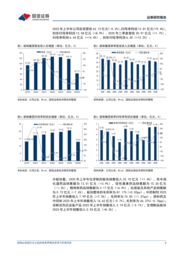 2025年上半年业绩逐步企稳,盈利能力持续提升。2025年上半年公司实现营收62.72亿元(-0.2%),归母净利润12.81亿元(+9.4%),扣非归母净利润12.58亿元(+8.9%)。2025年二季度营收30.91亿元(+1.7%),归母净利润6.44亿元(+14.4%),扣非归母净利润6.40(+13.2%)。分板块看,2025年上半年化学制剂板块销售收入32.70亿元(+1.4%),其中消化道药品销售额为13.51亿元(+3.9%),促性激素药品销售额为15.30亿元(-1.2%),精神类药品销售额为3.17亿元(+6.9%),抗感染及其他产品销售额为0.72亿元(-7.4%),板块整体的毛利率为81.17%(+0.02pp);中药制剂2025年上半年销售收入7.99亿元(+7.3%),毛利率为74.0%(-1.57pp);原料药及中间体2025年上半年销售收入16.62亿元(-5.7%),毛利率为36.37%(-0.76pp);诊断试剂及设备产品2025年上半年销售收入3.74亿元(-5.1%),生物制品板块2025年上半年销售收入0.95亿元(+8.3%)。