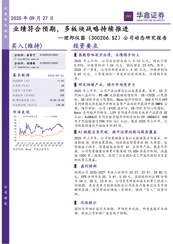 理邦仪器在2025年上半年通过稳健的业绩增长、持续的研发投入和AI技术的赋能,实现了市场竞争力的提升和服务范围的扩展。公司在监护仪、心电图机、超声诊断仪等多个产品线上均有显著进展,并通过智慧健康业务的拓展,实现了更广泛的医疗机构覆盖。维持“买入”评级,表明了对公司未来发展的信心。