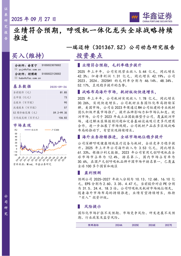 预测公司2025-2027年收入分别为10.13、12.68、16.10亿元,EPS分别为2.60、3.35、4.47元,当前股价对应PE分别为31.5、24.4、18.3倍。公司呼吸机及耗材市场地位领先,随着海外市场布局的持续推进,业绩有望持续增长,维持“买入”投资评级。