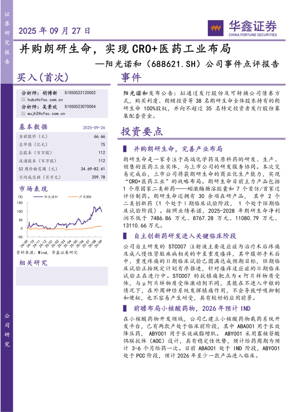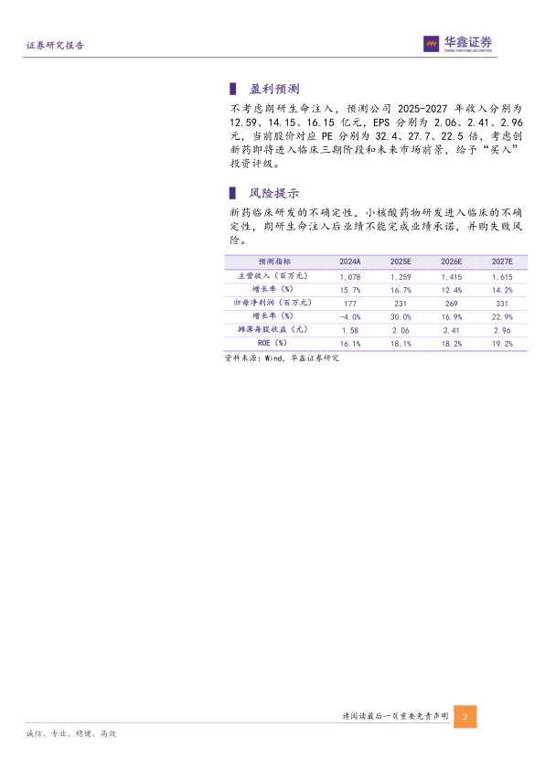 不考虑朗研生命注入,预测公司2025-2027年收入分别为12.59、14.15、16.15亿元,EPS分别为2.06、2.41、2.96元,当前股价对应PE分别为32.4、27.7、22.5倍,考虑创新药即将进入临床三期阶段和未来市场前景,给予“买入”投资评级。