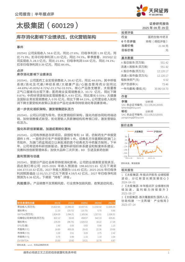 太极集团2025年上半年业绩受到库存消化等因素影响,导致营收和利润大幅下滑。公司正通过优化组织架构、调整营销策略和强化科研创新来应对挑战。天风证券基于公司业绩表现,下调了其盈利预测和投资评级。投资者应关注公司面临的各项风险,并结合自身投资目标进行独立判断。