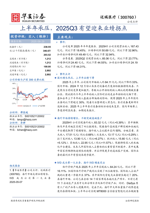 本报告认为,迈瑞医疗2025年上半年业绩承压,主要受国内市场下滑影响。但海外市场保持增长,IVD业务表现亮眼。预计2025年第三季度国内市场有望迎来拐点,维持“买入”评级。