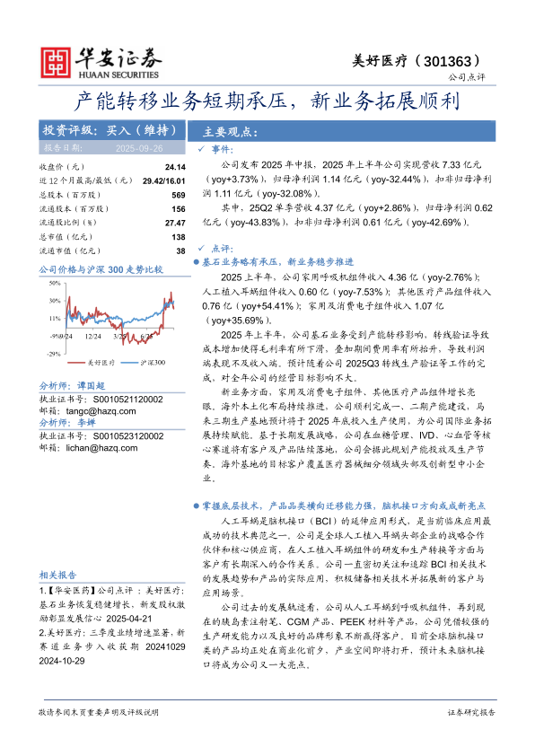 2025年上半年,公司基石业务受到产能转移影响,转线验证导致成本增加使得毛利率有所下滑,叠加期间费用率有所抬升,导致利润端表现不及收入端。预计随着公司2025Q3转线生产验证等工作的完成,对全年公司的经营目标影响不大。